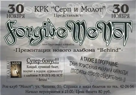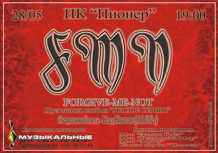Группа FORGIVE-ME-NOT была образована летом 1996 года в городе Тула (Россия). В первоначальный состав группы входили Виктор Куковеров (вокал/бас), Михаил Карасёв (гитара), Андрей Суханов (ударные).