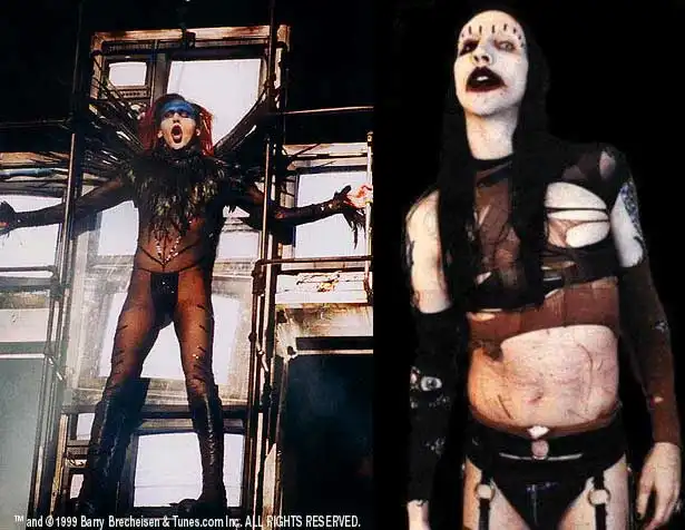 Концертные выступления группы характеризировались широким применением различных аттракционов; использовалось все, что могло усилить впечатление: бутерброды с ореховым маслом, которые разбрасывались со сцены, распятые или заключенных в клетки девушки, лысые козлиные головы, обнаженка и применение открытого пламени. У Гэси (клавишные) была маленькая кабинка, подписанная «Pogo’s Playhouse», в которой находились его синтезаторы. Берковиц мог играть в юбке, лифчике и длинном парике из светлых волос, его гитара висела очень низко и изо рта торчала сигарета, дополняя образ «плохого парня». Все это использовалось для получения максимального эффекта. В 2007 году Мэрилин Мэнсон возглавил список 20-ти самых сумасшедших звезд эстрады.
