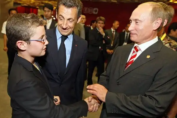 Президент Франции Николя Саркози знакомит Владимира Путина со своим сыном Луи.