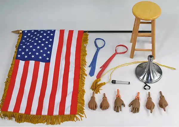С игрушечным президентом США в комплекте поставляется многочисленное оружие (от револьвера и ружья до катаны и лазерного меча), разные галстуки, часы, американский флаг и микрофон, чтобы он мог заболтать или запеть врагов до смерти.