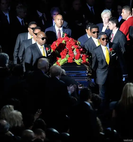 Порощание с королем поп-музыки Братья Джексон - Рэнди, Марлон, Джеки, Жермен и Тито - сопровождают гроб на публичную церемонию прощания в Staples Center. Майкл Джексон, 50 лет, икона поп-музыки, умер в медицинском центре UCLA после сердечного приступа, который он перенес 25 июня в своем доме в Лос-Анджелесе, Калифорния.
