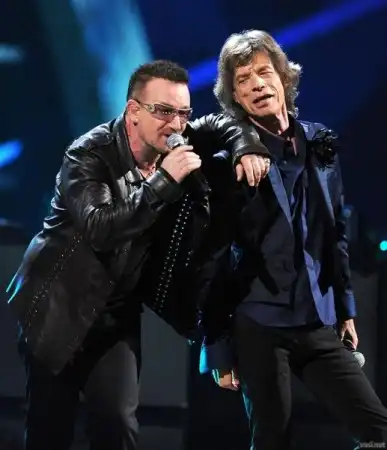 Юбилей Зала Славы Рок-н-ролла Боно (U2) и Мик Джаггер (The Rolling Stones) выступают вместе во время юбилейного концетра в честь 25-летия Зала Славы Рок-н-ролла на Madison Square Garden.
