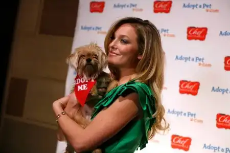 Актриса Элизабет Ром со своей собакой Бэмби на вечеринке «Будь моим Валентином» в Нью-Йорке 10 февраля 2010.