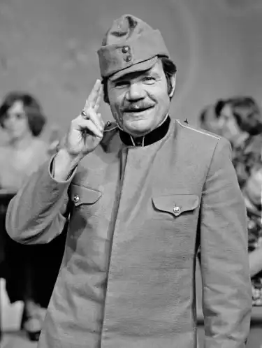 Москва, 1976. Михаил Пуговкин в роли бравого солдата Швейка на репетиции новогоднего «Голубого Огонька».