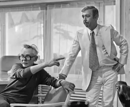 Москва, 1981. Режиссер Леонид Гайдай и актер Борислав Брондуков (справа) во время съемок комедийного фильма "Спортлото-82".