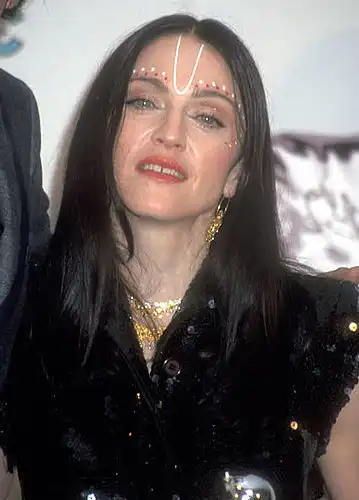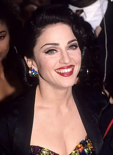 Мушка на щеке, темные волосы, уложенные в ретро-прическу и макияж в духе золотого века Голливуда делают Мадонну похожей на кинозвезд 30-х годов прошлого веска. Вам не кажется, что Дита фон Тиз позаимствовала свой яркий образ именно у Мадонны?