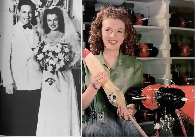 Первый раз Мэрилин вышла замуж в 16 лет, в 42 году, после чего бросила школу и поселилась у мужа, Джима Догерти. Это была скорее вынужденная мера, чем блажь, так как она боялась вновь попасть в детский дом. Приемная семья собиралась переезжать, а брать с собой они ее не хотели. Поэтому ранний брак был незамедлительно одобрен. Через год после свадьбы Джим ушел служить на флот, а Норма Джин пошла работать на авиационный завод.