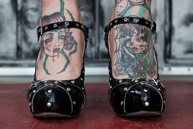 И уже в 14 лет на теле девушки появилась первая татуировка (рогатый череп), которую она долгое время удачно скрывала под школьной формой