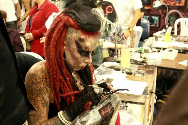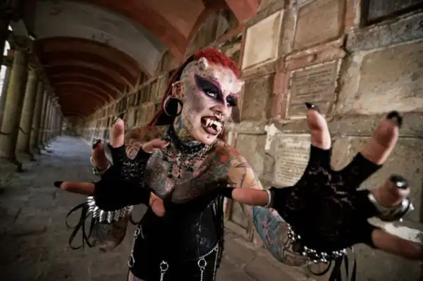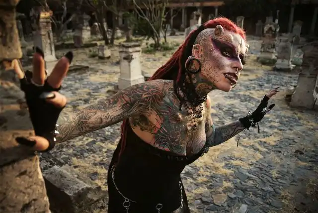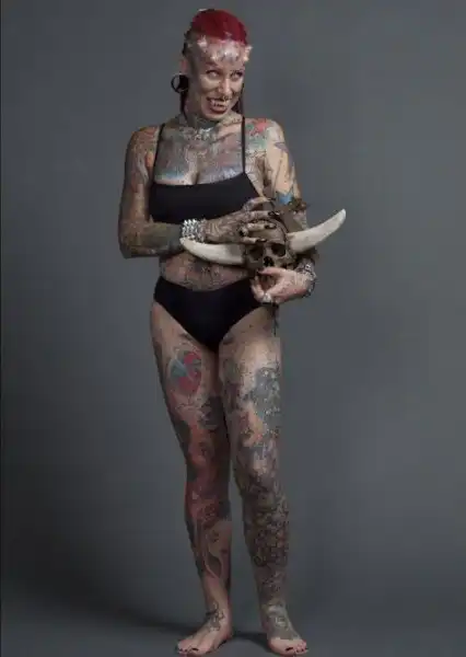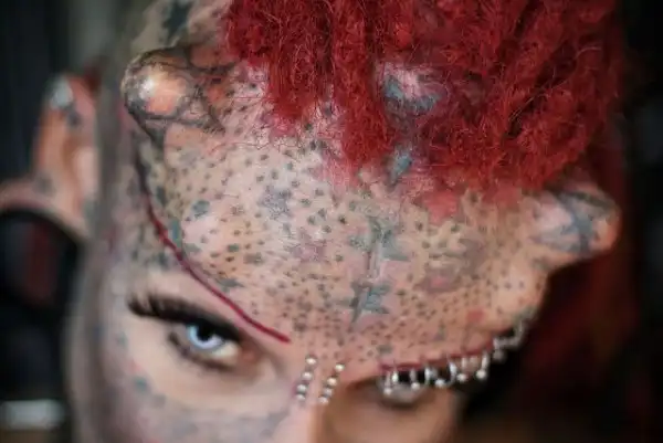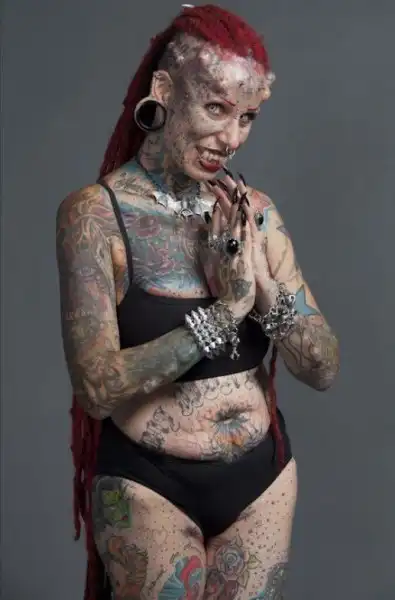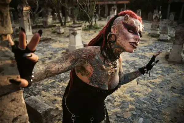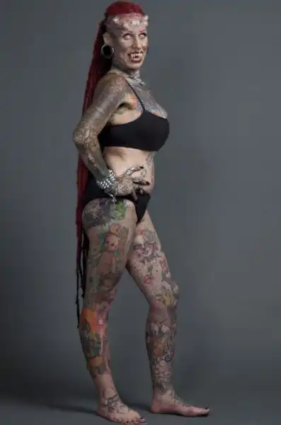 У этой 35-летней жительницы города Zapopan (штат Jalisco) 98 процентов тела покрыто татуировками, а кроме этого, имеется множественный пирсинг лица, шесть тефлоновых имплантантов, вживленных под кожу на груди и руках, четыре маленьких рога на голове, четыре клыка, и разделенный на две части язык.