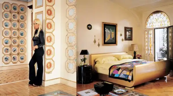 В интерьере спальни Донателлы доминирует эффектная металлическая кровать с золотым покрытием. Над кроватью - авторская копия картины Джорджо де Кирико "Великий метафизик". Балансировать на тонкой грани между роскошью и китчем Донателла умеет, как никто другой: "Люди зачем-то ограничивают себя рамками одного стиля, хотят, чтобы каждая вещь в их доме сочеталась со всеми остальными. Но ведь это так старомодно, даже если сами вещи - последнее слово дизайна. Люди боятся быть свободными, а ведь свобода - самое ценное в жизни!"
