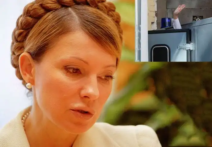 4. На фото: Тимошенка машет своим сторонникам, собравшимся возле Печерского суда из автозака.