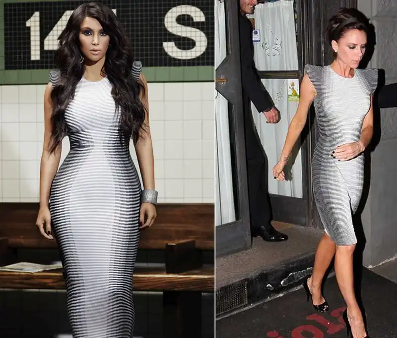 Платье с оптической иллюзией может быть трендом осени, но в 2009 году Виктория Бекхэм была первой, кто надел этот нарядс муаровым узором от Александра МакКуина. Почти два года спустя, рекламируя свое новое реалити-шоу «Kourtney and Kim Take New York» (Кортни и Ким завоевывают Нью-Йорк), Ким Кардашян дважды появилась на публике в более удлиненной версии платья от МакКуина.