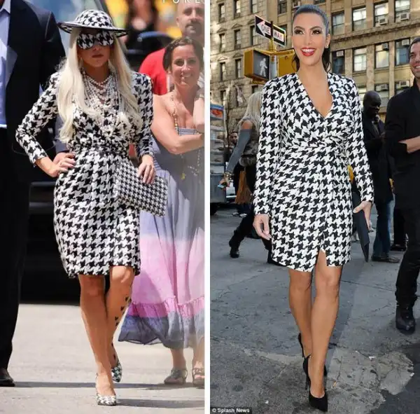 В августе, когда Леди Гага выступила соведущей шоу «The View», на ней был довольно скромный (по меркам Гаги) ансамбль: черно-белое в гусиную лапку платье от Сальваторе Феррагамо с подобранными к нему в тон шляпкой, клатчем и туфлями. (Хотя подобранные в тон очки были явно лишним аксессуаром.) Чуть позже Ким Кардашян появилась в эфире шоу «Today», и на ней было надето то же самое платье от Феррагамо, которое, кстати, очень ей шло. В тот же день Кардашян разместила в своем Твиттере фотографию, где она в этом платье сидит на черно-белом в гусиную лапку стуле в нью-йоркском отеле Gansevoort.