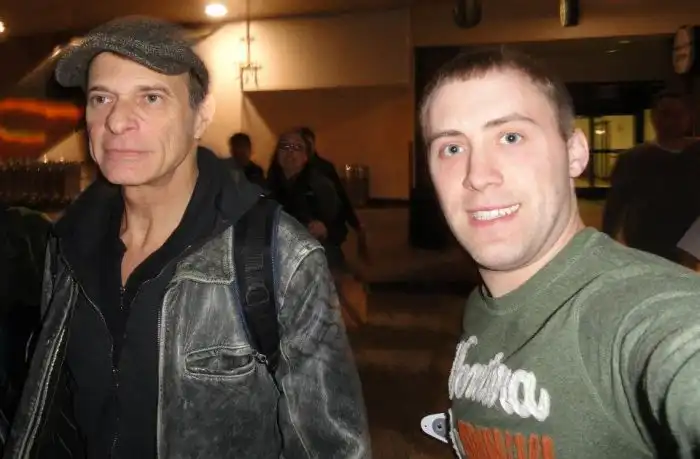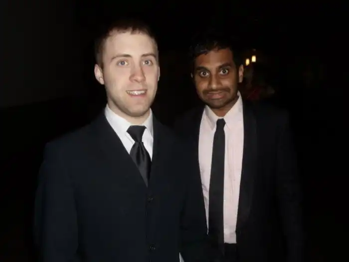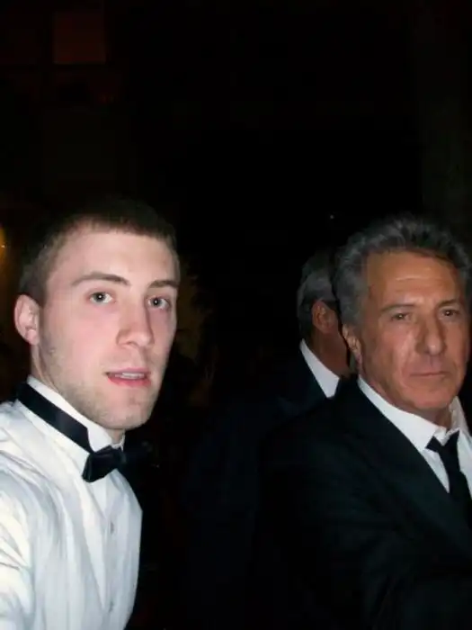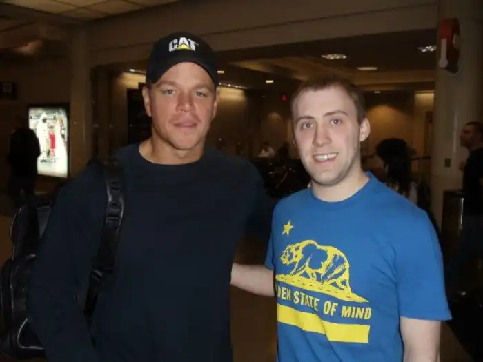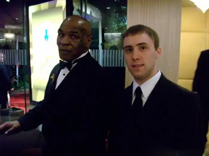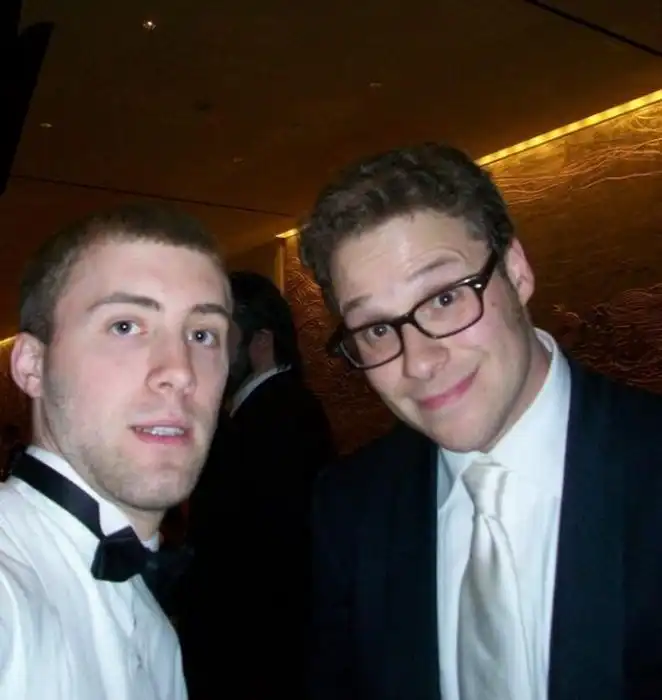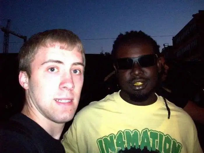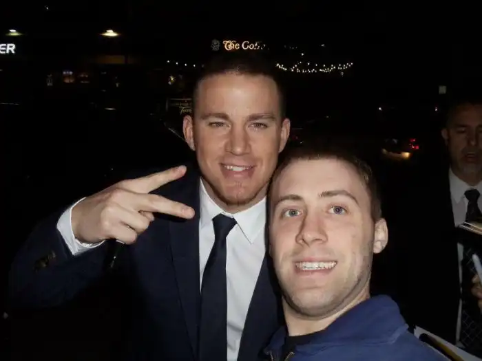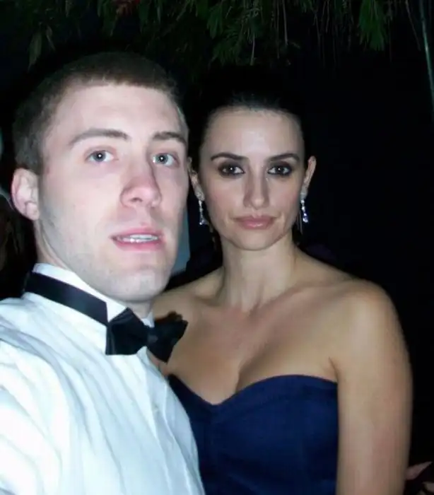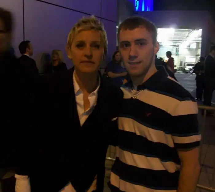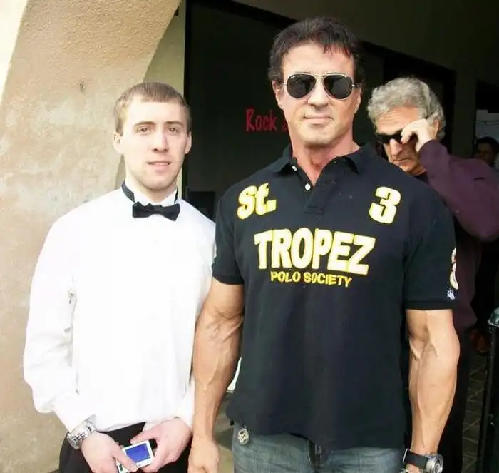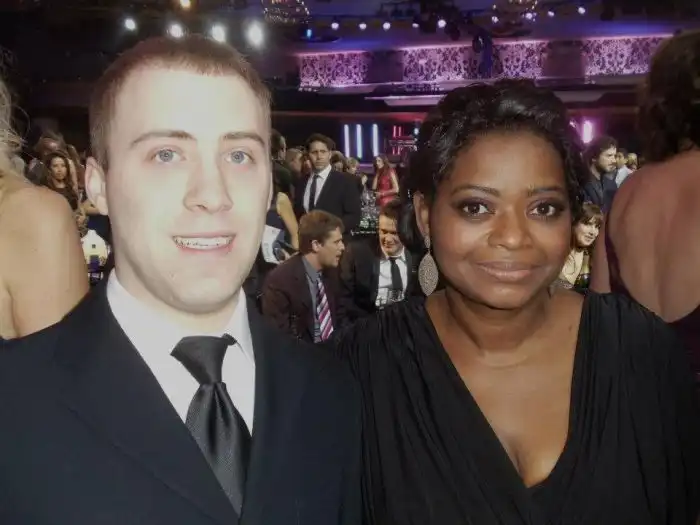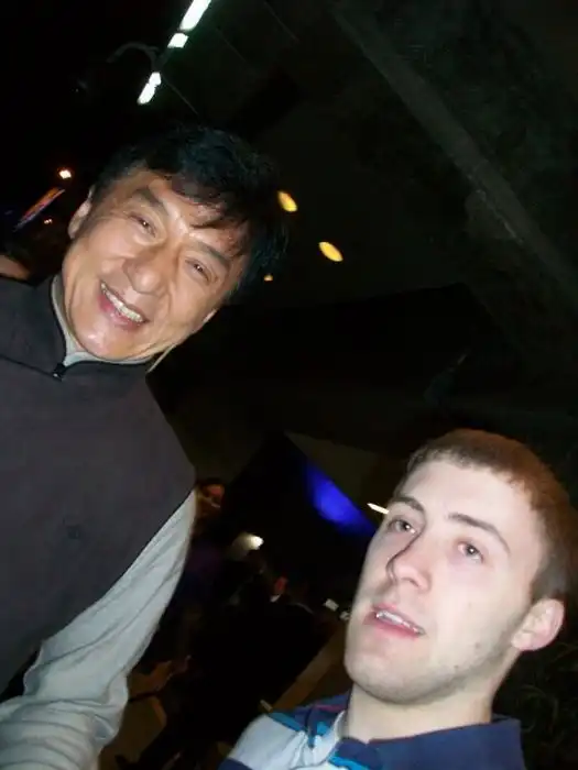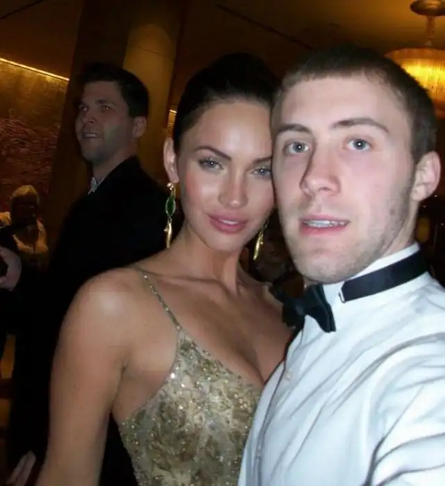 Парень с неловкой улыбкой фотографируется со звездами мировой величины.