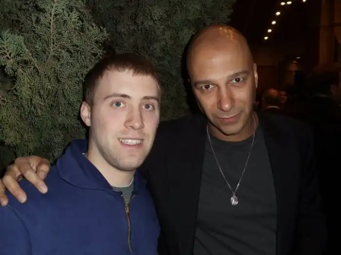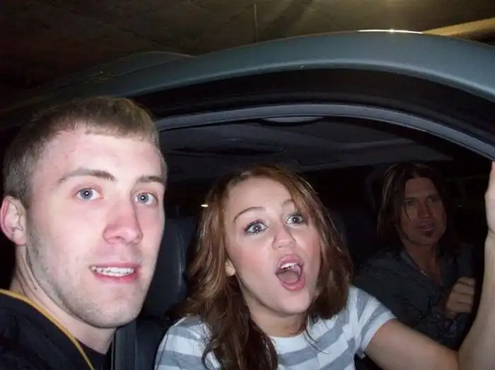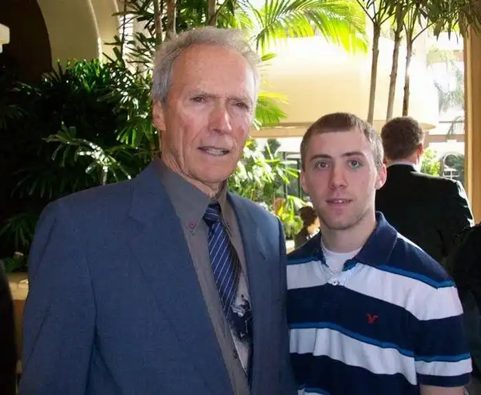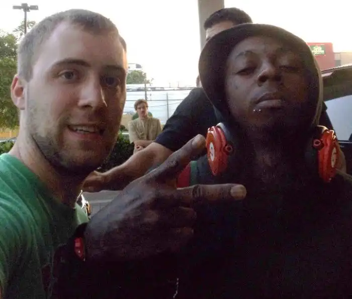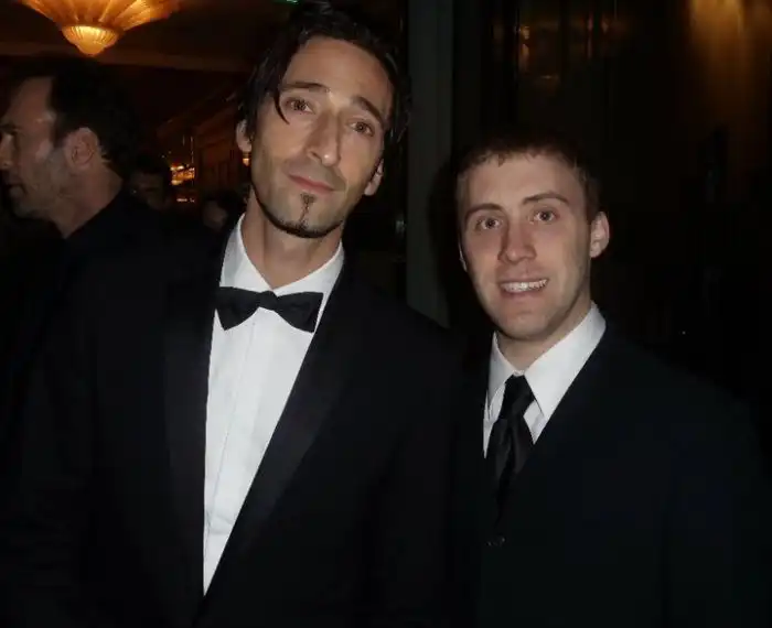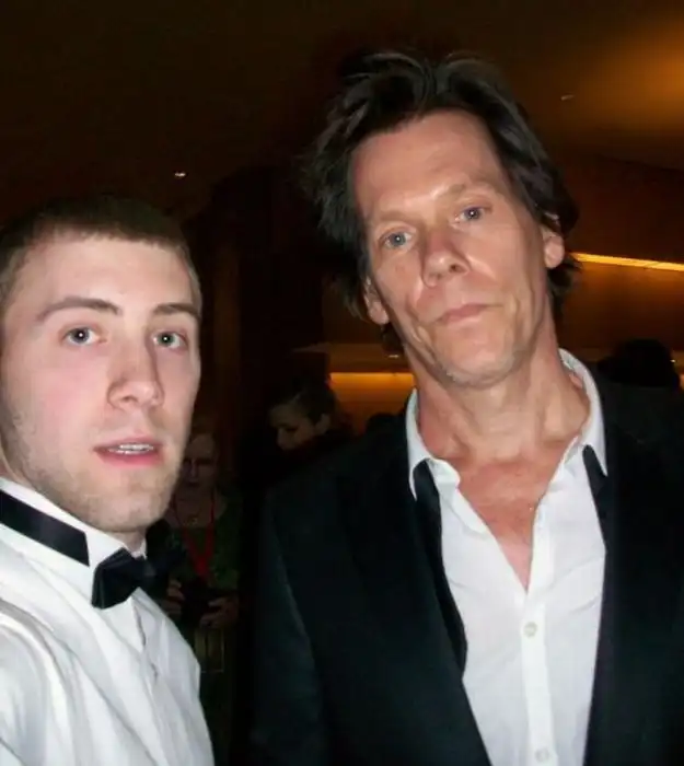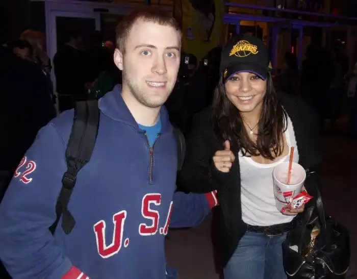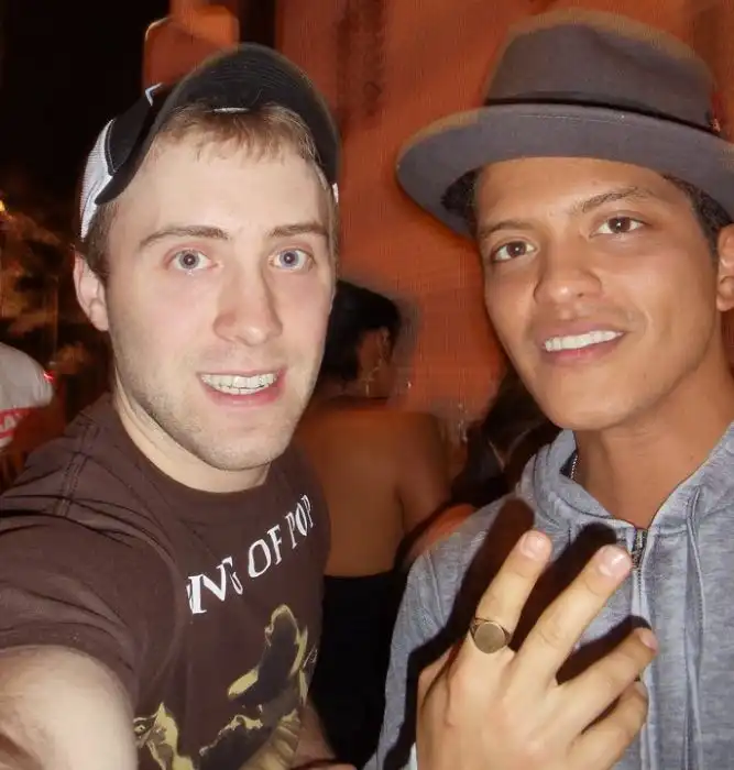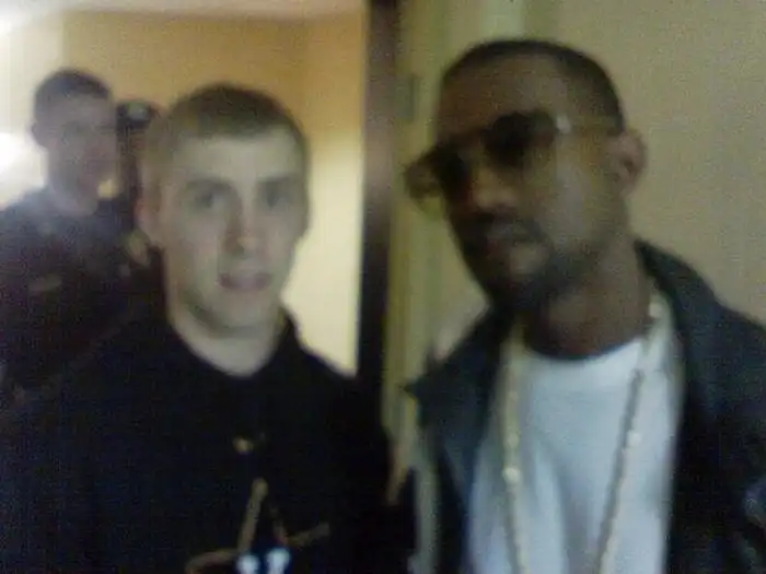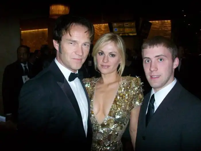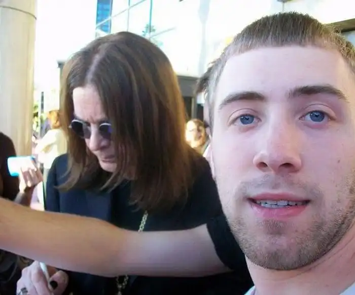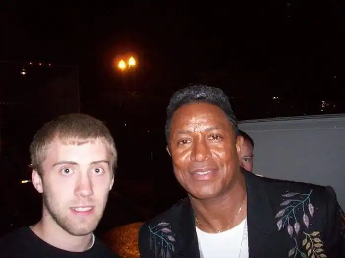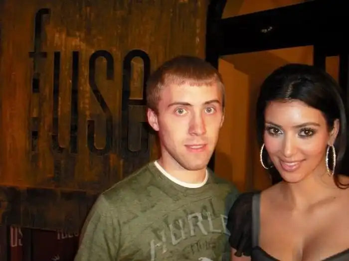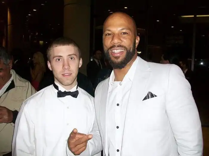Парень с неловкой улыбкой фотографируется со звездами мировой величины.
