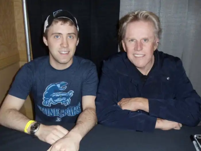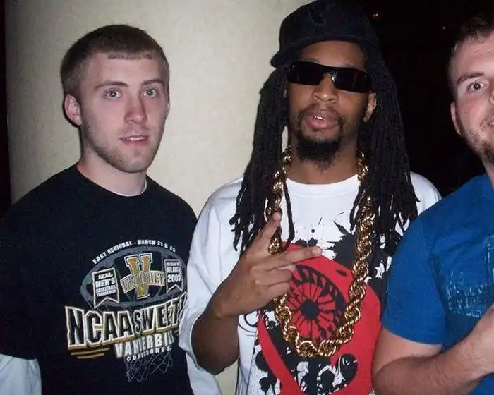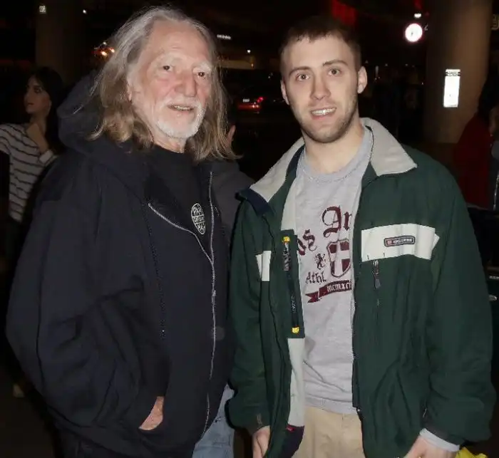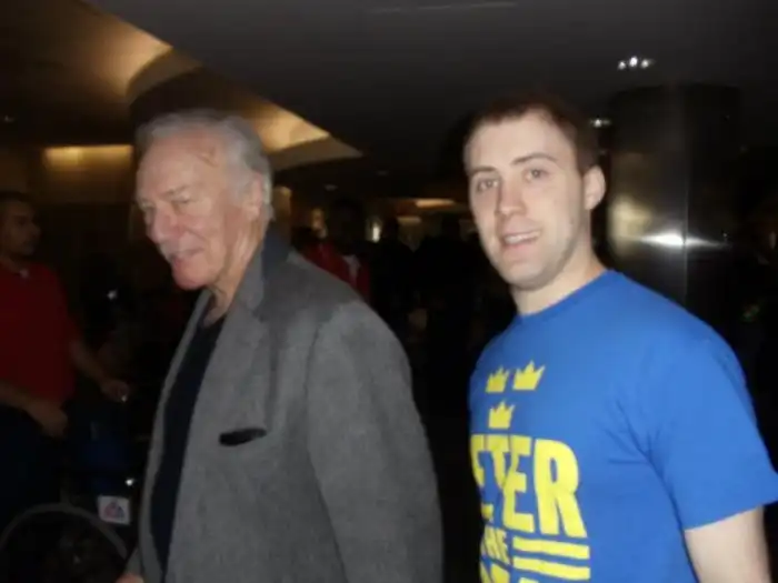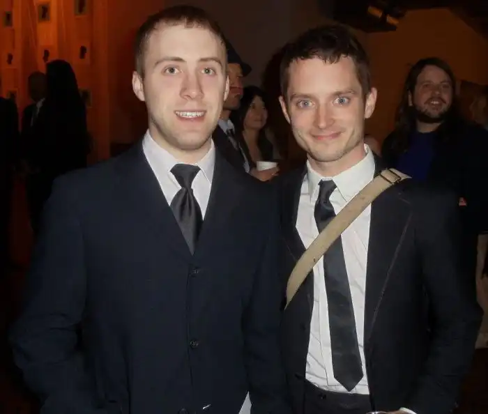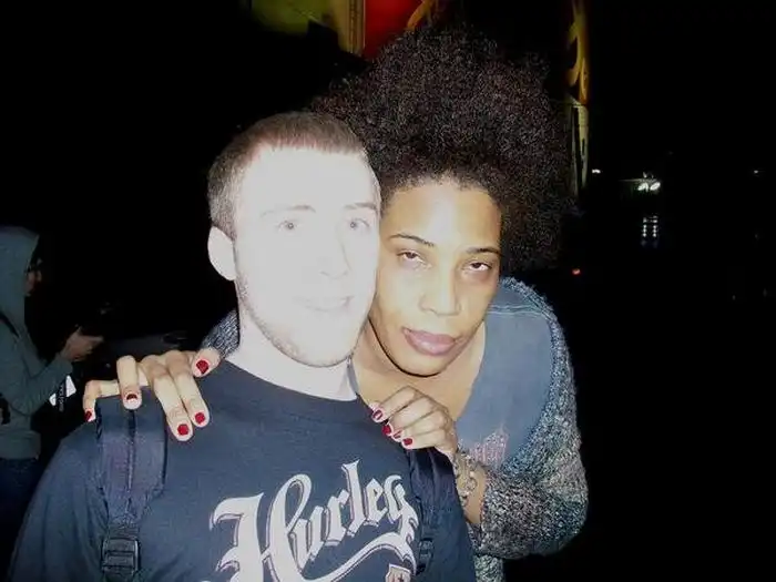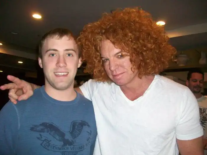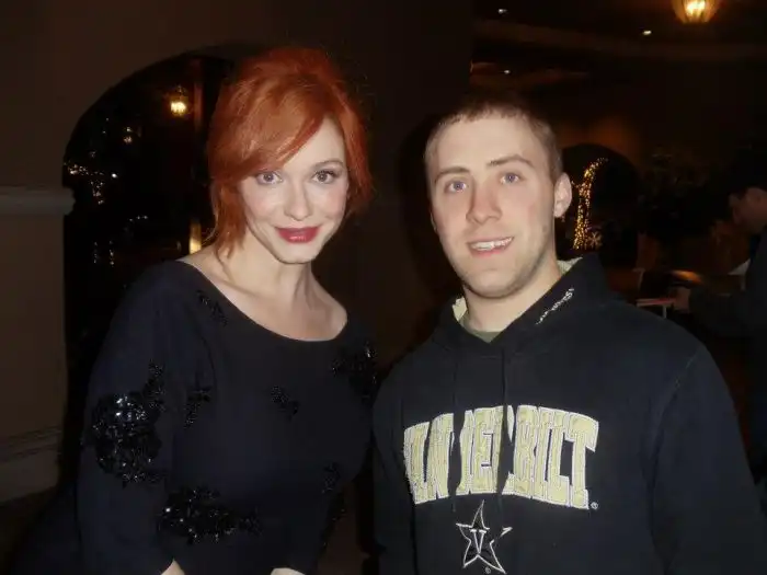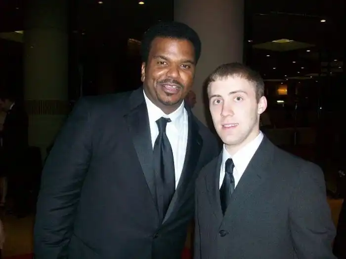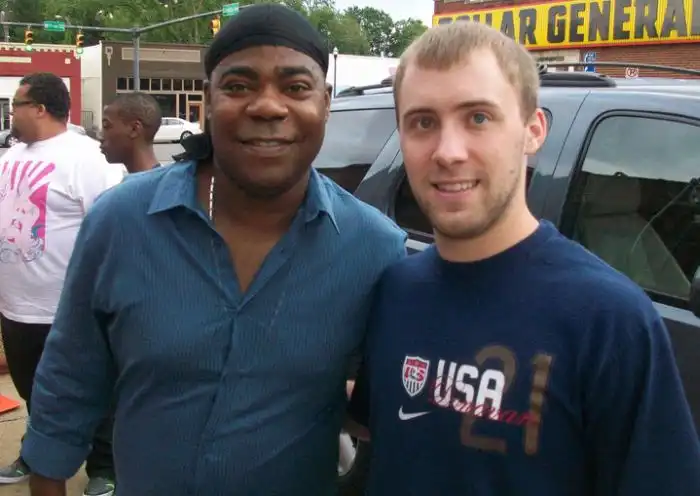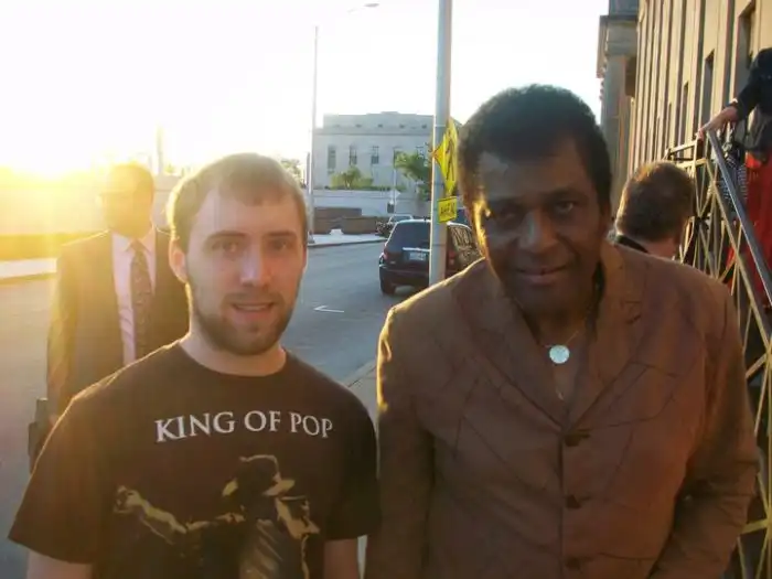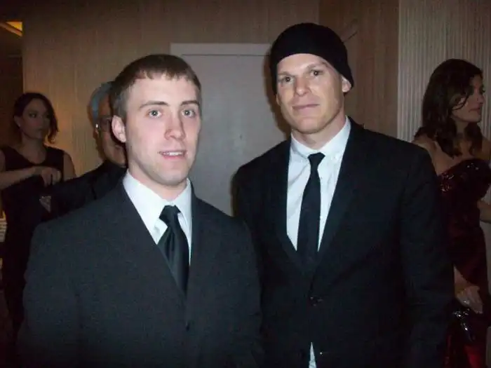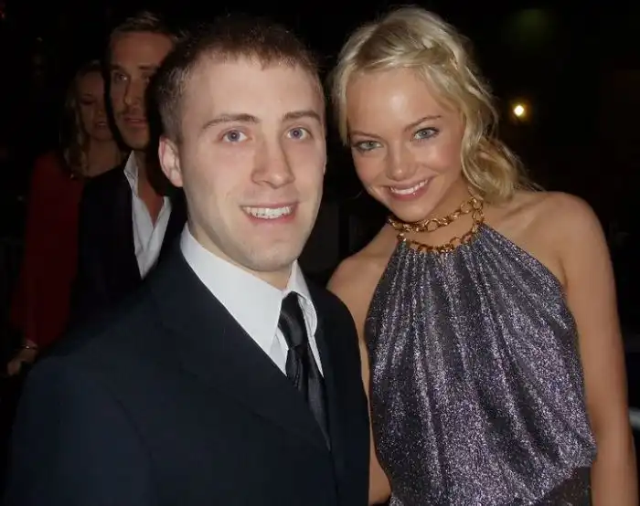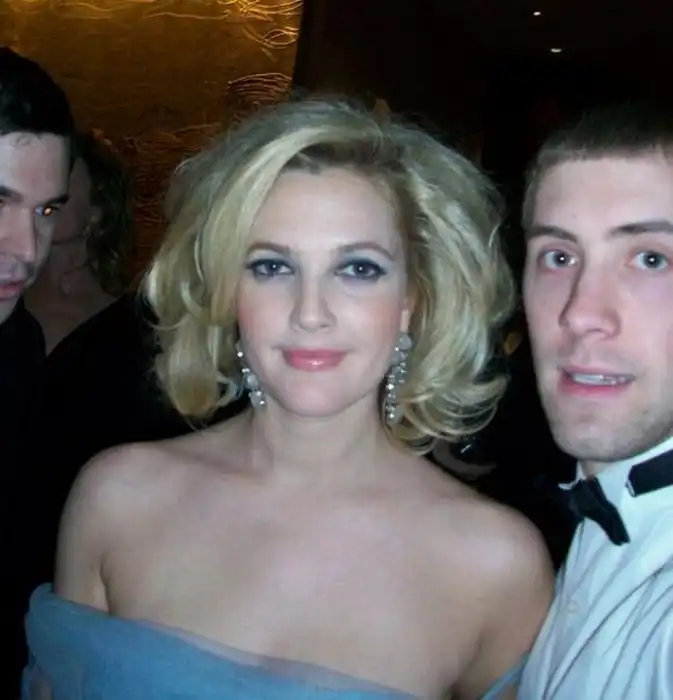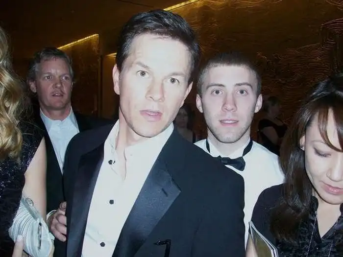 Парень с неловкой улыбкой фотографируется со звездами мировой величины.