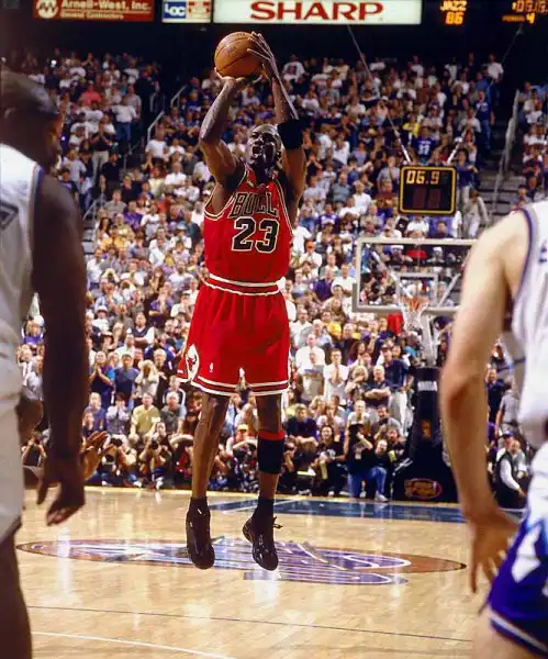 «Чикаго» вернулось в Юту на шестой матч финала 14 июня 1998 года, выигрывая в серии со счетом 3-2. На последних минутах Джордан обокрал Карла Мэлоуна[87] и, пройдя с дриблингом через всю площадку, забил победный мяч. Он обманул финтом Брайна Рассела, также как и год назад, на последних секундах первого матча Финальной серии 97 года между Ютой и Чикаго. Джон Стоктон попробовал спасти матч, но не забил трёхочковый мяч на последней секунде. Майкл Джордан по окончании Финала НБА поднял над головой руки, показав на этот раз шесть пальцев — он привел свою команду к шестому чемпионскому титулу. Этот момент был признан величайшим в истории плей-офф НБА.[87] Джордан был признан MVP финала,[57] набирая в среднем 33,5 очков за игру. Финал НБА до сих пор считается самым рейтинговым телевизионным событием, а шестая игра собрала максимальную телеаудиторию в истории НБА.