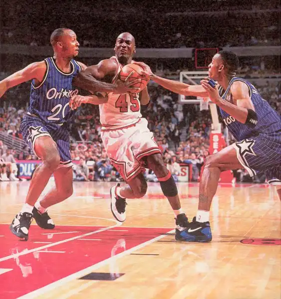 Хотя Джордан и пропустил полтора года, играл он на прежнем уровне — уже в четвёртой игре после своего возвращения, против «Атланта Хокс» Майкл совершает победный бросок, а в матче против «Никс» в Мэдисон Сквер Гардане 28 марта 1995 года Джордан набрал 55 очков.[46] Усилившись Джорданом, «Буллз» вышли в плей-офф и дошли до полуфинала в Восточной конференции, где встретились с «Орландо Мэджик». В конце первой игры серии игрок Орландо Ник Андерсон выбил мяч у Джордана со спины при броске, позже заметив, что Джордан «не похож на старого Майкла Джордана» [81] Уже в следующей игре Джордан вернул себе старый номер (23), но несмотря на 31 очко за игру в этой серии, «Орландо» выиграли в шести матчах