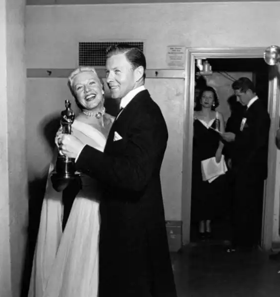 3. Джинджер Роджерс и Джордж Мерфи танцуют за кулисами, держа Оскар перед тем как обьявить победителя, 1950г.