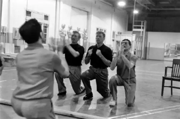 6. Кирк Дуглас и Берт Ланкастер с хореографом Джек Коул репетируют свой танцевальный номер под песню “It’s Great Not to Be Nominated” 1958г.