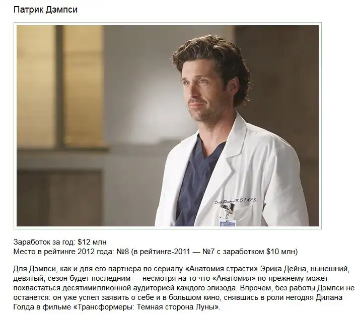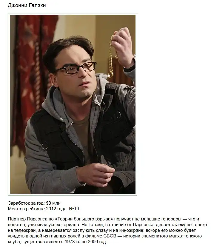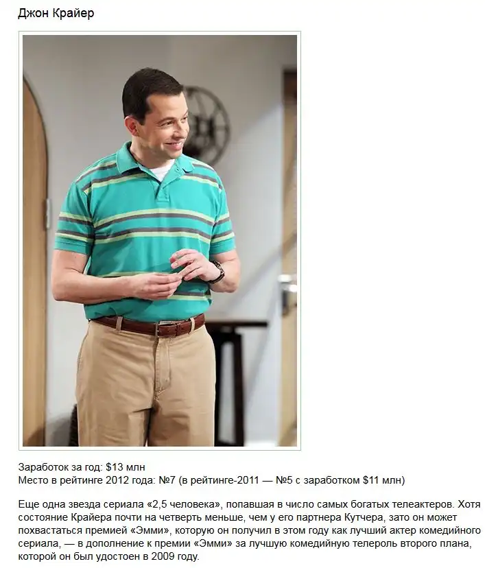 Свежий рейтинг самых высокооплачиваемых актеров со всего мира, который в 2012 году возглавил звезда сериала «2,5 человека» Эштон Кутчер. Советую вам ознакомиться с остальными претендентами на звание самого состоятельного актера телесериалов в мире в продолжении поста.