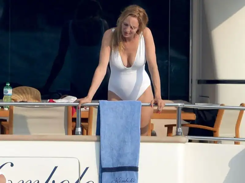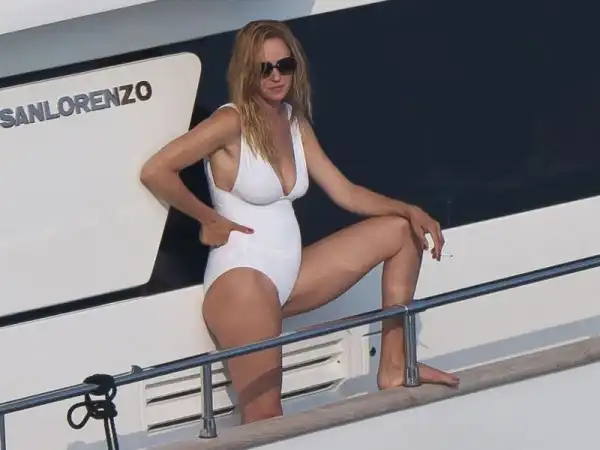 15 июля 2012 года Ума Турман родила своему мужу дочь, которую креативные родители назвали Розалинд Арушу Аркадину Алталун Флоренс Турман-Буссон. С тех пор прошел год, но 43-летняя актриса так и не вернула себе былую форму. На этих фотографиях, сделанных в Сен-Тропе, живот ее выглядит так, будто она на четвертом месяце беременности. Возможно, что напрягаться нет смысла, потому как никто не предлагает достойных ролей.