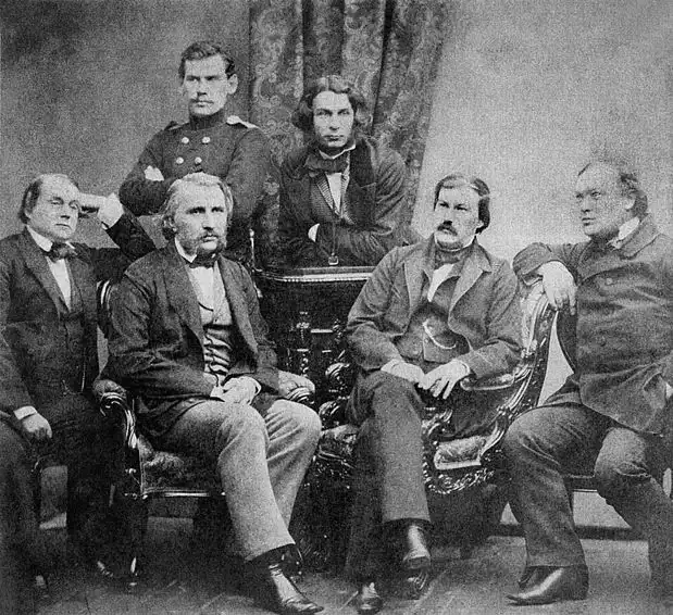 Русские писатели круга журнала «Современник». И. А. Гончаров, И. С. Тургенев, Л. Н. Толстой, Д. В. Григорович, А. В. Дружинин и А. Н. Островский. 15 февраля 1856 г. Фотография С. Л. Левицкого.