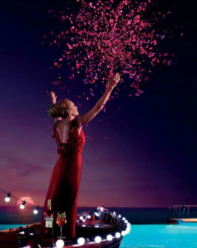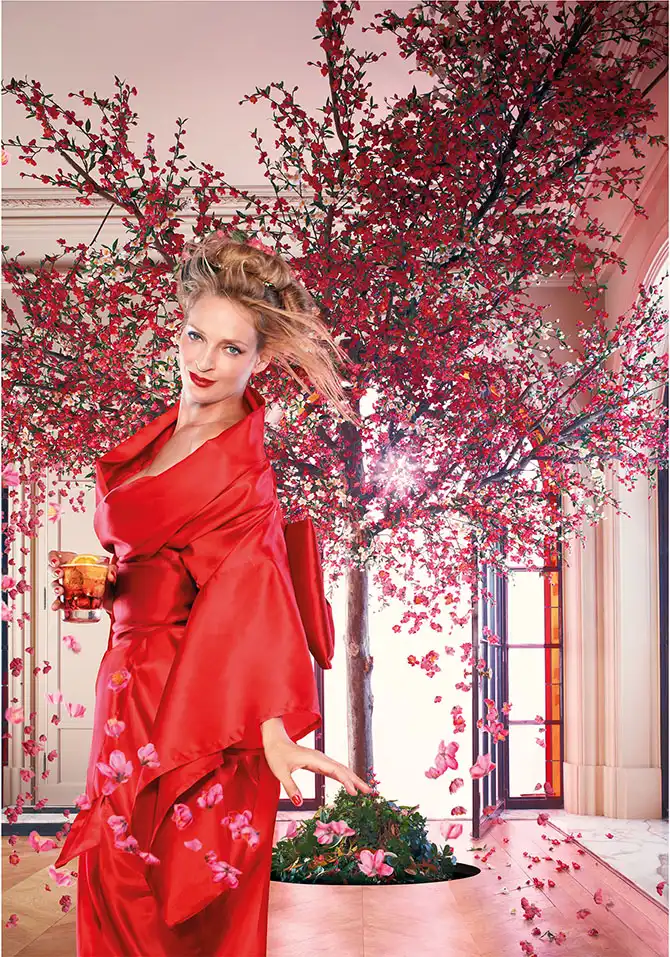 Неизменными на всех снимках остаются лишь красные детали гардероба Умы, отдающие дань ключевому ингредиенту кампари — алому красителю из крыльев мушки кошенили.