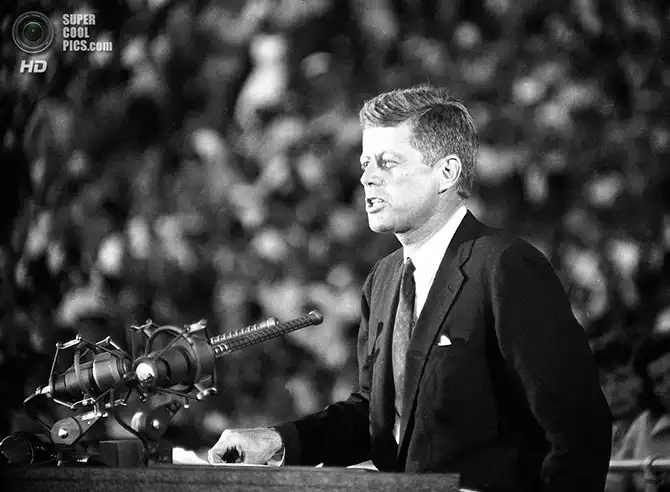 Сенатор Джон Ф. Кеннеди объявляет перед 65-тысячной аудиторией, что он будет кандидатом от Демкоратической партии на пост президента в кампании 1960 года. Калифорния. 15 июля 1960 года.