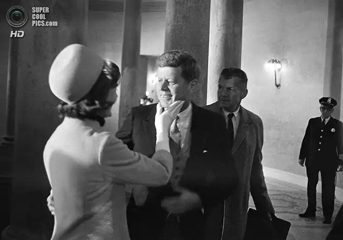 Жаклин Бувье поздравляет своего мужа с инаугурацией. Вашингтон. 20 января 1961 года.