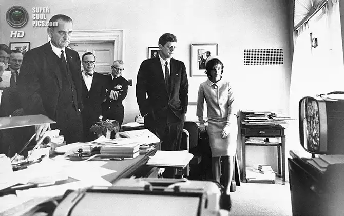 Линдон Б. Джонсон присягает на верность родине в качестве нового президента страны после смерти Джона Ф. Кеннеди. Всё это происходило в экстренном порядке на борту президентского самолёта. Линдон Б. Джонсон стоит перед федеральным судьёй Сарой Т. Хьюз; среди прочих его сопровождает жена Леди Бёрд. 23 ноября 1963 года.