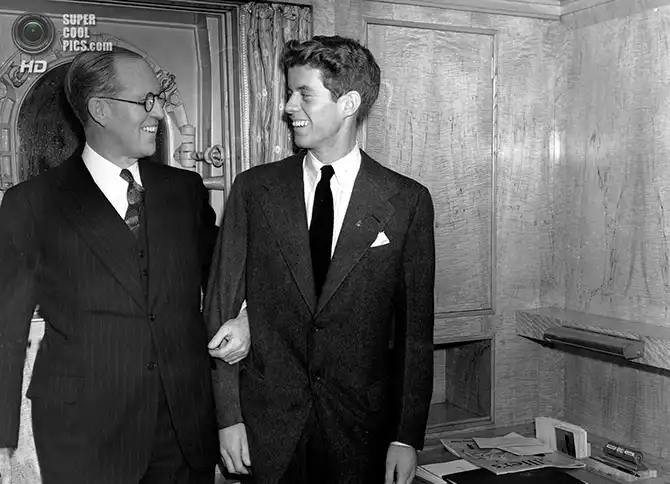 Посол США в Великобритании Джозеф П. Кеннеди со своим 20-летним сыном Джоном. Джон Ф. Кеннеди был вторым сыном и одним из девяти детей политика и магната Джозефа П. Кеннеди; его первый сын был убит на Второй мировой войне. Нью-Йорк. 5 января 1938 года.