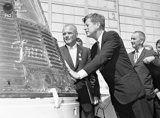 Астронавт Джон Гленн с президентом Джоном Ф. Кеннеди осматривает космический корабль «Френдшип-7» перед полётом «Меркурий-Атлас-6». Канаверал, Флорида. 23 февраля 1962 года.