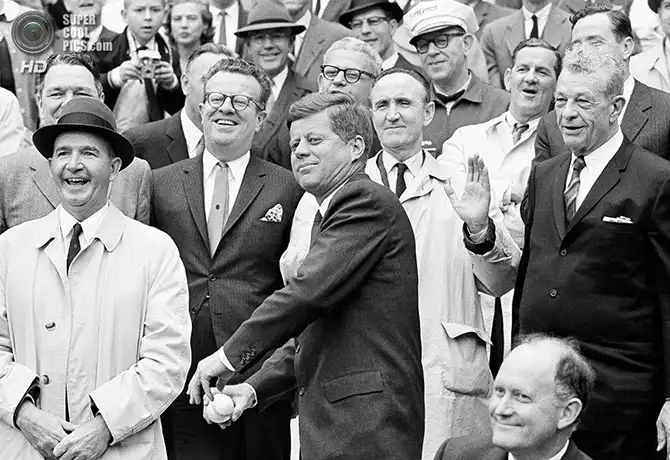 Президент Джон Ф. Кеннеди дает старт новому сезону Американской лиги бейсбола. Вашингтон. 8 апреля 1962 года.