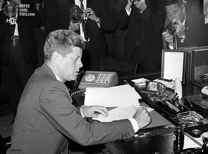 Президент Джон Ф. Кеннеди подписывает президентский указ касательно Карибского кризиса. Вашингтон. 23 октября 1962 года.