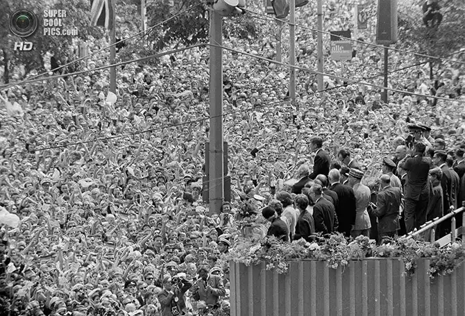 Миллионы доброжелателей встречают президента США Джона Ф. Кеннеди у Красной ратуши. Здесь он получил самый тёплый приём за всю свою карьеру политика. Берлин. 26 июня 1963 года.
