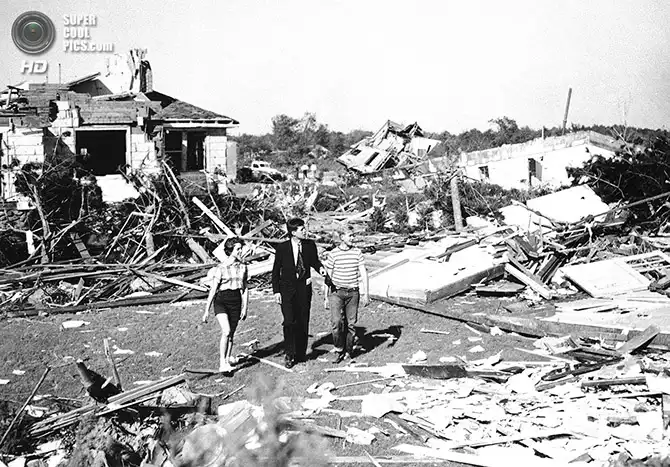 Сенатор Джон Ф. Кеннеди вместе с 15-летним Диком Майером и 14-летней Мелиссой Тайлер осматривает повреждения, вызванные мощным торнадо. 86 человек погибли, 800 — получили травмы, 2 500 — остались без домов. Шрусбери, Массачусетс. 10 июня 1953 года.