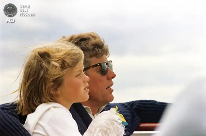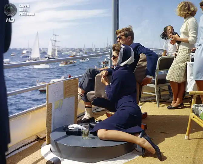 Президент Джон Ф. Кеннеди со своей женой Жаклин наблюдают за стартом «Кубка Америки» с борта корабля USS «Джозеф П. Кеннеди, младший», названного в честь покойного брата президента. Ньюпорт, Род-Айленд. 25 августа 1963 года.