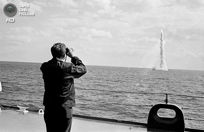 Президент Джон Ф. Кеннеди наблюдает за пуском ракеты «Поларис». Канаверал, Флорида. 16 ноября 1963 года.