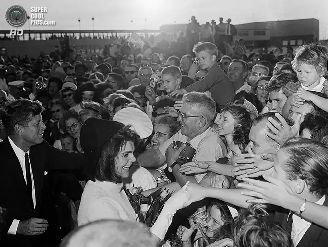 Доброжелатели приветствуют президента Джона Ф. Кеннеди и первую леди Жаклин Кеннеди в Международном аэропорту Хьюстона. Техас. 21 ноября 1963 года.