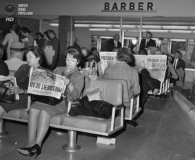 Пассажиры в аэропорту Лав-Филд читают газеты, где сказано об убийстве президента Джона Ф. Кеннеди. Даллас, Техас. 23 ноября 1963 года.