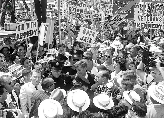 Сенатор Джон Ф. Кеннеди в окружении тысяч доброжелателей. Миннеаполис, Миннесота. 2 октября 1960 года.