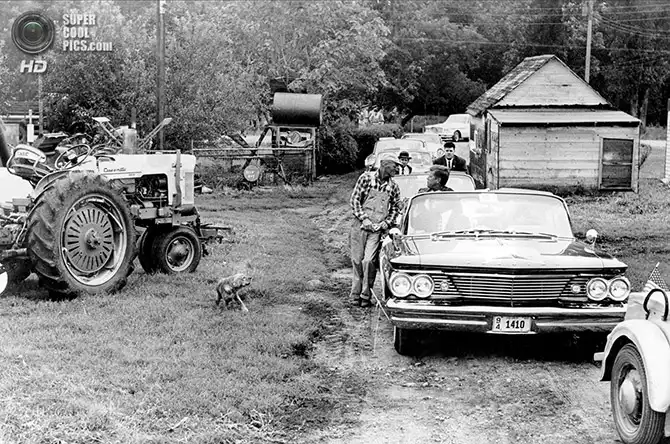 Кандидат в президенты США от Демократической партии Джон Ф. Кеннеди на заднем сидении своего «Понтиака» общается с фермером Джеймсом Коксом. Форт-Додж, Айова. 22 сентября 1960 года.