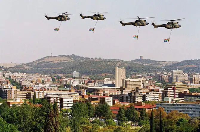 Вертолеты на церемонии инаугурации первого чернокожего президента страны Нельсона Манделы в Претории, Южная Африка, 10 мая 1994 года.