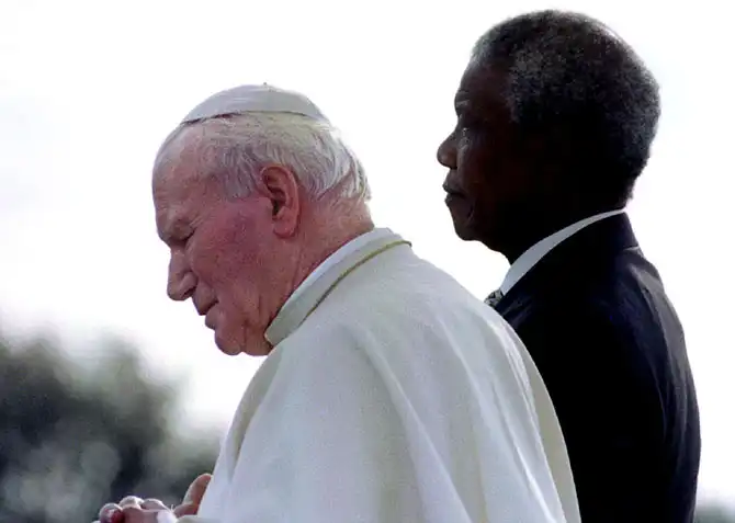 Президент ЮАР Нельсон Мандела и Папа Иоанн Павел II слушают государственный гимн в международном аэропорту Йоханнесбурга во время первого официального визита Папы в страну, 16 сентября 1995 года.