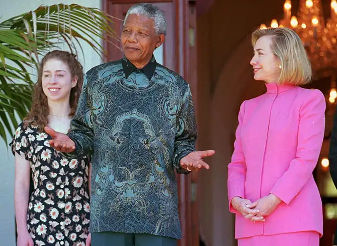 Президент ЮАР Нельсон Мандела и первая леди США Хиллари Клинтон с дочерью (слева) на встрече в Кейптауне, 20 марта 1997 года.