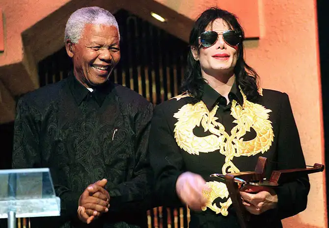 Бывший президент ЮАР Нельсон Мандела и Майкл Джексон в Сан-Сити, Южная Африка, 4 сентября 1999 года.