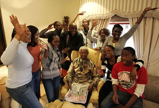 Бывший президент ЮАР Нельсон Мандела позирует с внуками в своем доме в Южной Африке, 18 июля 2008 года.