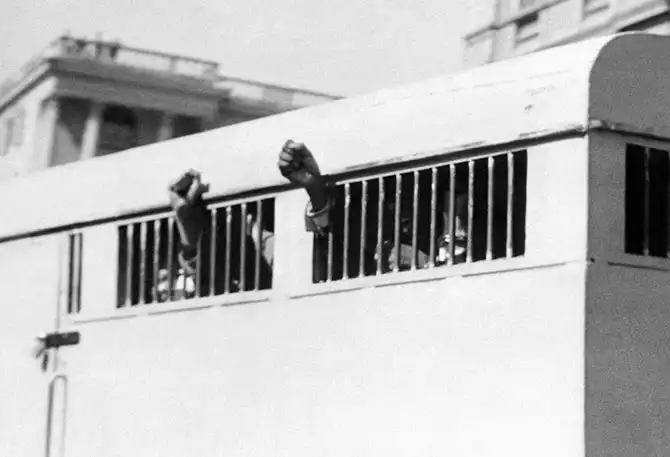 Вот как раз один из арестов. Нельсон Мандела уезжает в полицейском фургоне, Йоханнесбург, Южная Африка, 31 декабря 1956 года.
