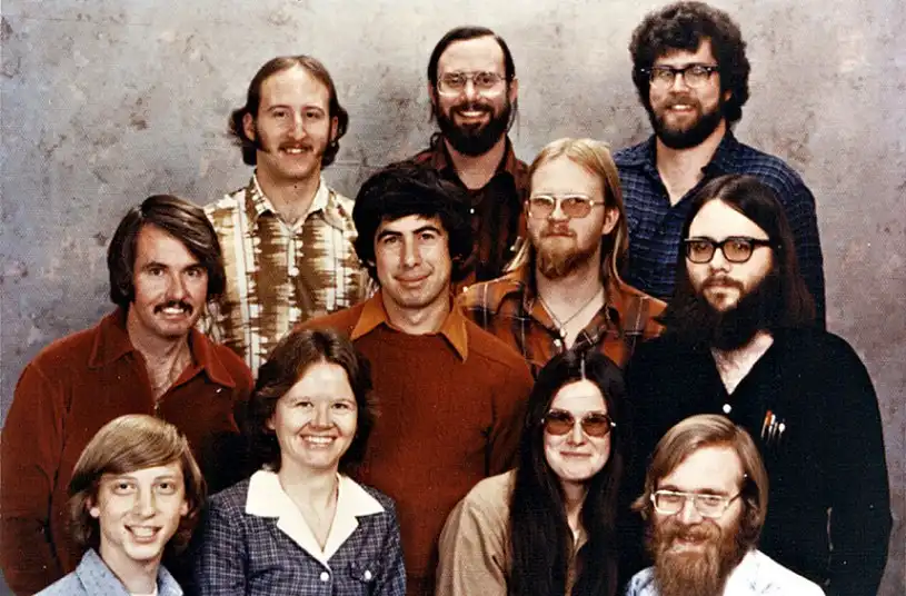 На фото члены «Группы Альбукерке», первоначальные 11 членов корпорации Майкрософт, которые работали в офисах компании в Альбукерке, Нью-Мексико. Задний ряд, слева, Стив Вуд, Боб Уоллес, Джим Лейн; второй ряд, слева направо: Боба O ‘Риа, Боб Гринберг, Марк Макдональд, Гордон Летвин; передний ряд, слева направо: соучредитель Билл Гейтс, Андреа Льюис , Марла Вуд, и соучредитель Пол Аллен.